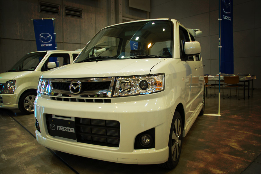 ▲ここからは各ディーラーさんのエリアをひとつずつ回っていきます。トップバッターはマツダさん。AZワゴンのFT-Sスペシャルです。スパルタンな印象もパール・ホワイトのカラーリングが上品さと交じり合い、とても魅力的です。