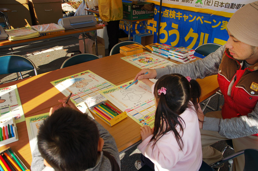 ▲山梨県自動車整備振興会さんによるぬり絵コーナーです。ファミリー世帯が多く訪れて「てんけんくん」に色を塗っていました。