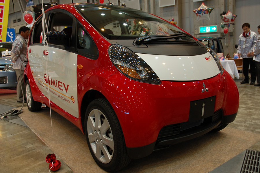▲軽自動車の未来を予感させる電気自動車、三菱の「iMiEV」です。「i」をベースに開発しています。ガソリン給油口に垂れ下がったコンセントが強いインパクトです。リクエストに応えてモーターを始動していただきましたが、まったくの無音。大容量リチウムイオン電池と高性能モーターでフル充電で走行距離160km。脱石油社会の第一歩として更なる進化が期待されます。