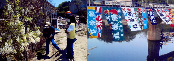活動中、家が2メートル近く浸水なさった所のご主人にこっちへ来て見て下さい、水没して、諦めていた白藤の花が満開です)と見せて頂いた花の美しさ、鉄橋に掲げられた大漁旗に再興への希望と思いが感じられました。