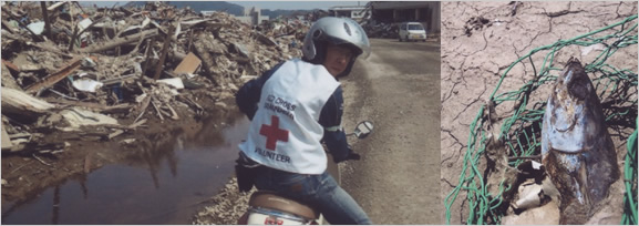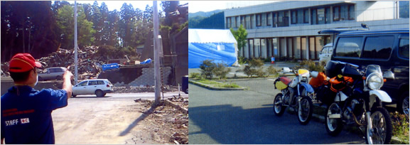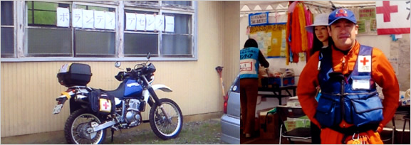 震災より2ヵ月後、日本赤十字社山梨支部より要請があり宮城県気仙沼市に「バイク隊」先発隊の一員としてバディーでもある鈴木東(スズキアズマ)氏と共に活動をしてきました。