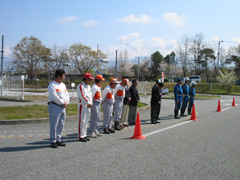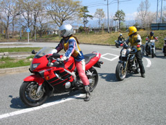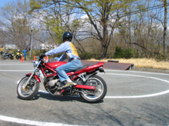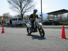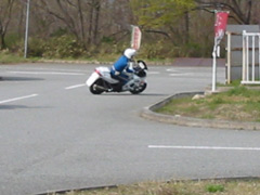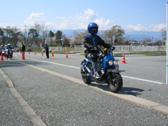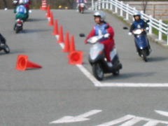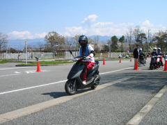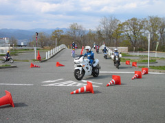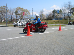 ▲スラロームです。アクセルを緩めたり開いたりしながら小刻みに車体を左右に振りながら進みます。また、スピードが出過ぎないようブレーキも小刻みに使っていきます。 その後、熟練度によって班別にわかれての総合訓練が開始されました。初心者の方には基礎テクニックの復習を中心に、また中級者以上の方には安全運転に関するテクニックの更なる向上を目指してのトレーニングが行われました。